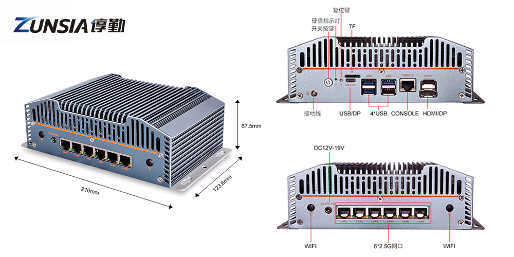 顯示方面有HDMI2.0、DP、Type-C(USB3.0+DP);帶有豐富的外接接口, 6網口、TPM2.0、M-Key 2280 SSD、STAT3.0、RS232、USB2/3.0等;滿足與其他外接控制器、工業攝像頭、稱重傳感器等設備的互聯;DC12-19V的電源供電,支持Windows和Linux操作系統,可在-20℃至+60℃工作,鋁合金的外殼讓其有良好的散熱以及防塵抗擾的能力。